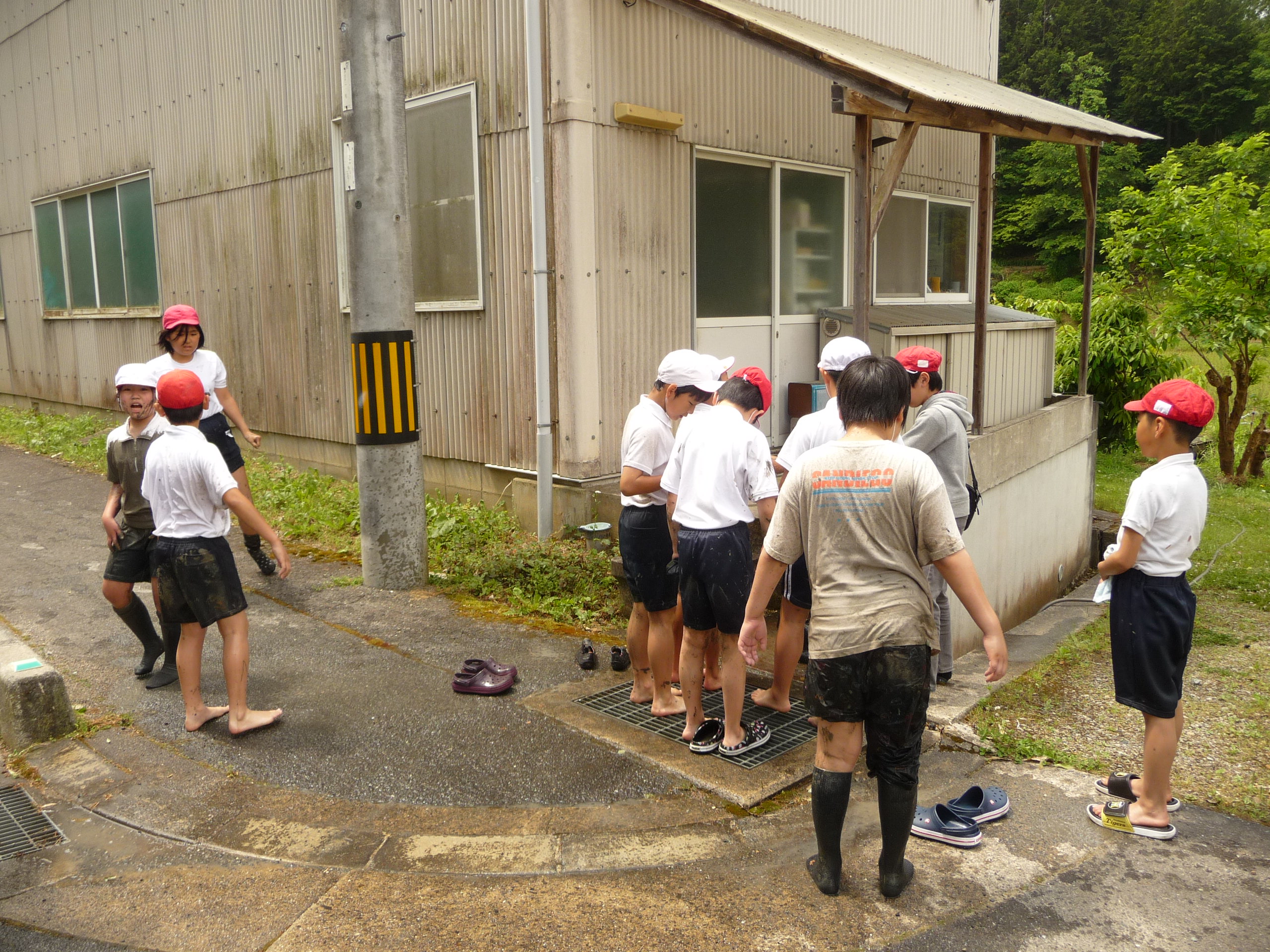 5月21日(火)に地域の方に協力していただき、4年生と5年生が田植え体験を行いました。苗の間隔や本数が、できるだけ均等になるように、地域の方に教えていただきながら、みんな一生懸命に手で植えました。ぬかるむ田んぼに足を取られて尻もちをつく子どもたちもいて、笑顔と歓声が広がりました。田んぼの提供や準備、苗作り、長時間に渡る田植えの方法のご指導、足洗い場の提供など、大変お世話になり、ありがとうございました。また、この後の田んぼの水の調節などの管理をよろしくお願いします。秋の収穫が楽しみです。
